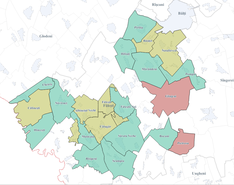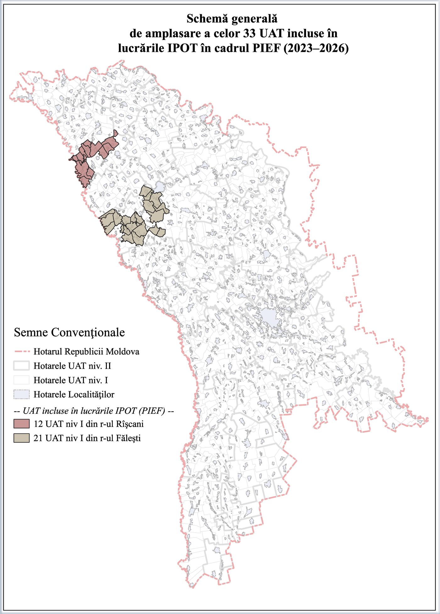 Реализация IPOT в рамках контракта (2023–2026)И.С. «Institutul de Proiectări pentru Organizarea Teritoriului» (IPOT) выполняет комплекс кадастровых работ на основании заключённого контракта (период выполнения: 2023–2026) на территории отдельных UAT двух районов Республики Молдова: Фэлешть — 21 UAT и Рышканы — 12 UAT. Ниже представлена обзорная схема расположения 33 UAT, включённых в работы IPOT в рамках PIEF (2023–2026). Статус выполнения работ (февраль 2026)Ниже представлены изображения по районам Фэлешть и Рышканы, где выполняются работы IPOT. Цветовая индикация отражает текущий статус выполнения в зависимости от доли реализованных объёмов. Расположение UAT по районам (PIEF), окрашенных по статусу выполнения.