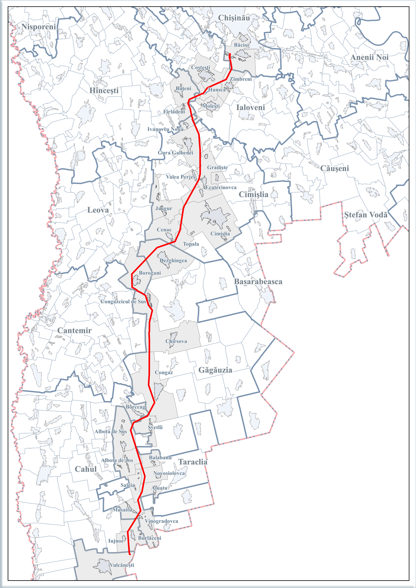 Высоковольтная ЛЭП 400 кВ Вулкэнешть–Кишинэу проходит по территории 34 административно-территориальных единиц (АТЕ) первого уровня, пересекая 8 районов (АТЕ - второго уровня) в южной и центральной частях страны.